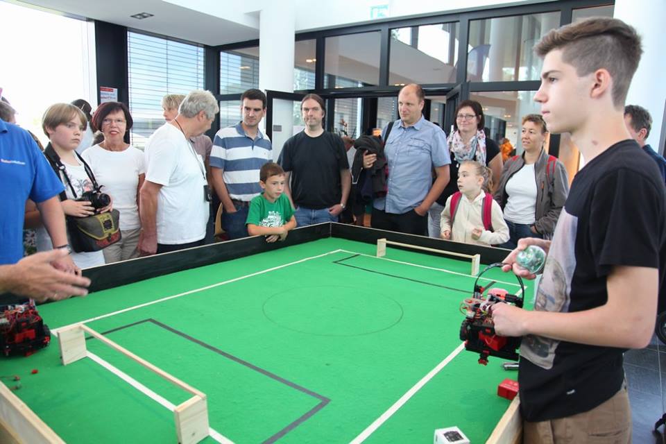 Bei diesem Wettbewerb spielen die Teams mit selbstgebauten und selbstprogrammierten Robotern Fußball. Die Roboter bewegen sich völlig autonom auf dem Spielfeld. Sie orientieren sich nur durch Sensoren.